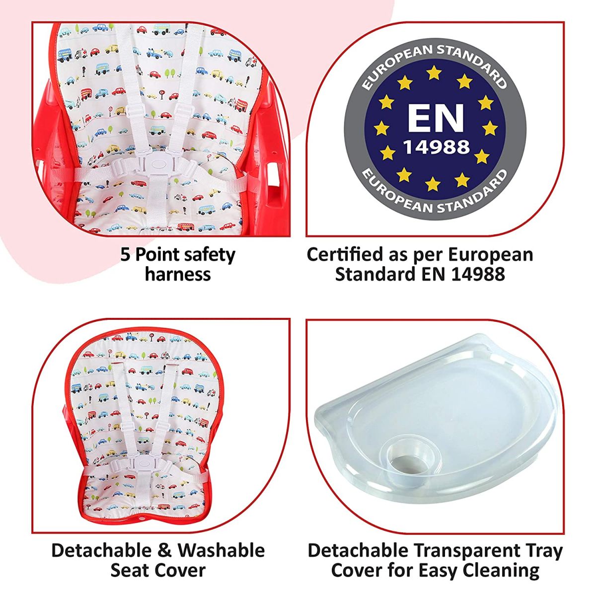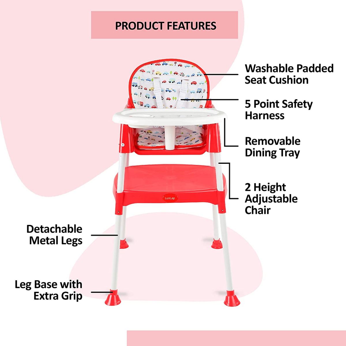 The 4-in-1 convertible high chair can be used as a high chair, low chair, Booster seat on a dining chair and as well as on floor. It comes with adjustable removable food tray and seat cover that can easily be washed. With a 3-point safety harness system, adjustable dining tray and compact folding makes this a smart solution for Mom.