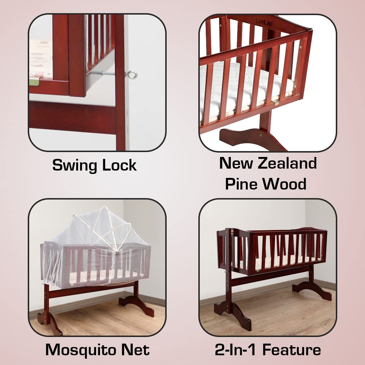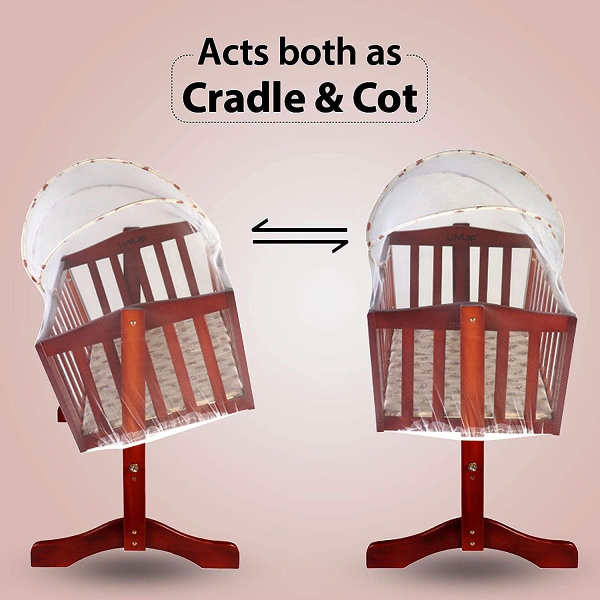 • Cot is easily converted into a rocking cradle by flipping the wheels up to transform cot into a rockerLuvLap C – 70 Baby wooden cot with rocker is designed for little babies to protect them from falling down and keep them safe. Cot C – 70 is known for its innovative design and it’s reliable features making it more classic and luxurious. Cot is easily converted into a rocking cradle. The Wheels can be flipped to transform cot into a rocker.