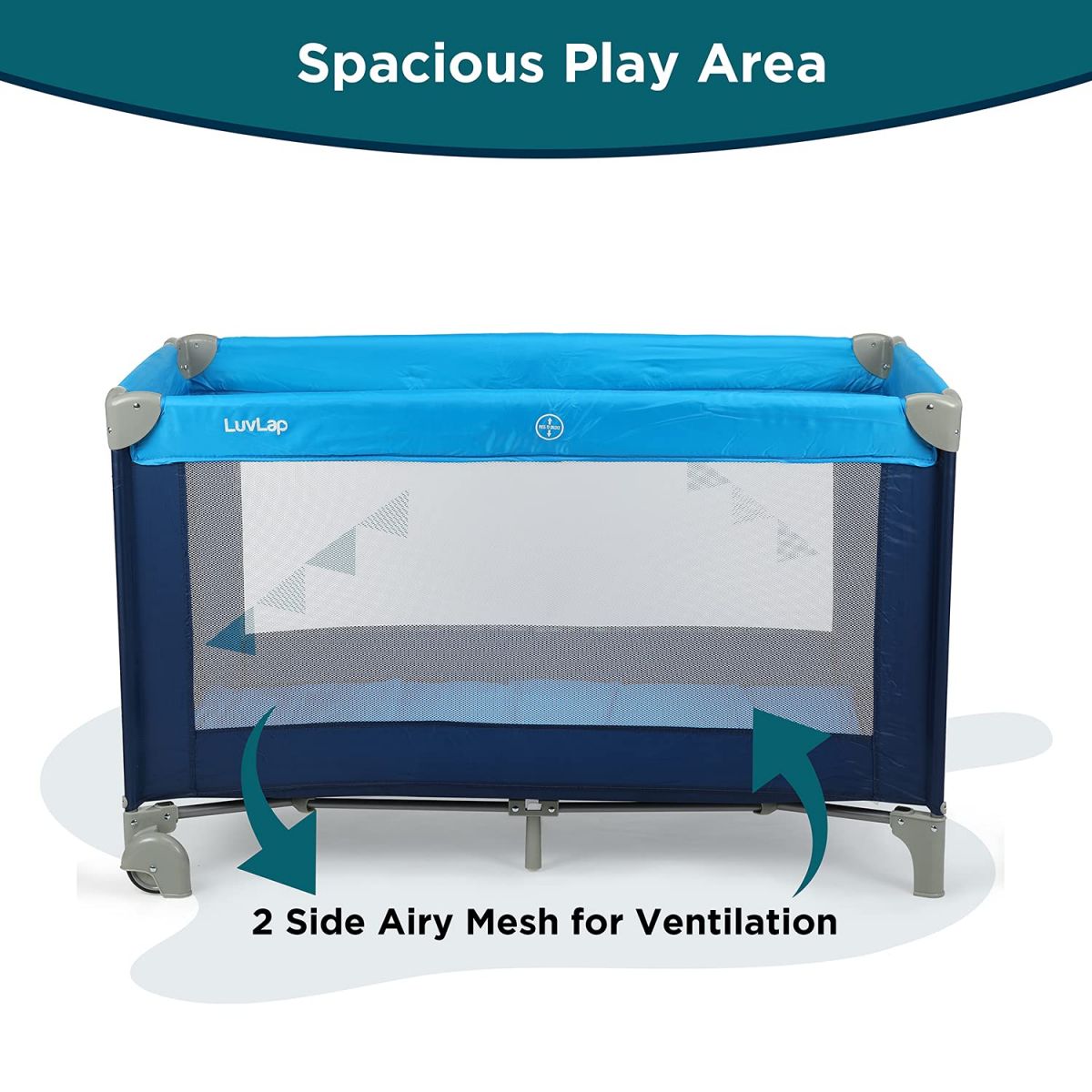 LuvLap Sunshine Playpen is certified as per EN Standards. It has a durable frame and easy-folding system, making it ideal for travel. It has an airy mesh on 2 sides for ventilation and visibility. It is compact, easy to fold and carry, and has 2 handy wheels. It has a convenient zipper door for baby and a 2 cm comfortable mattress. It comes with a Mosquito Net and a convenient travel carry bag
