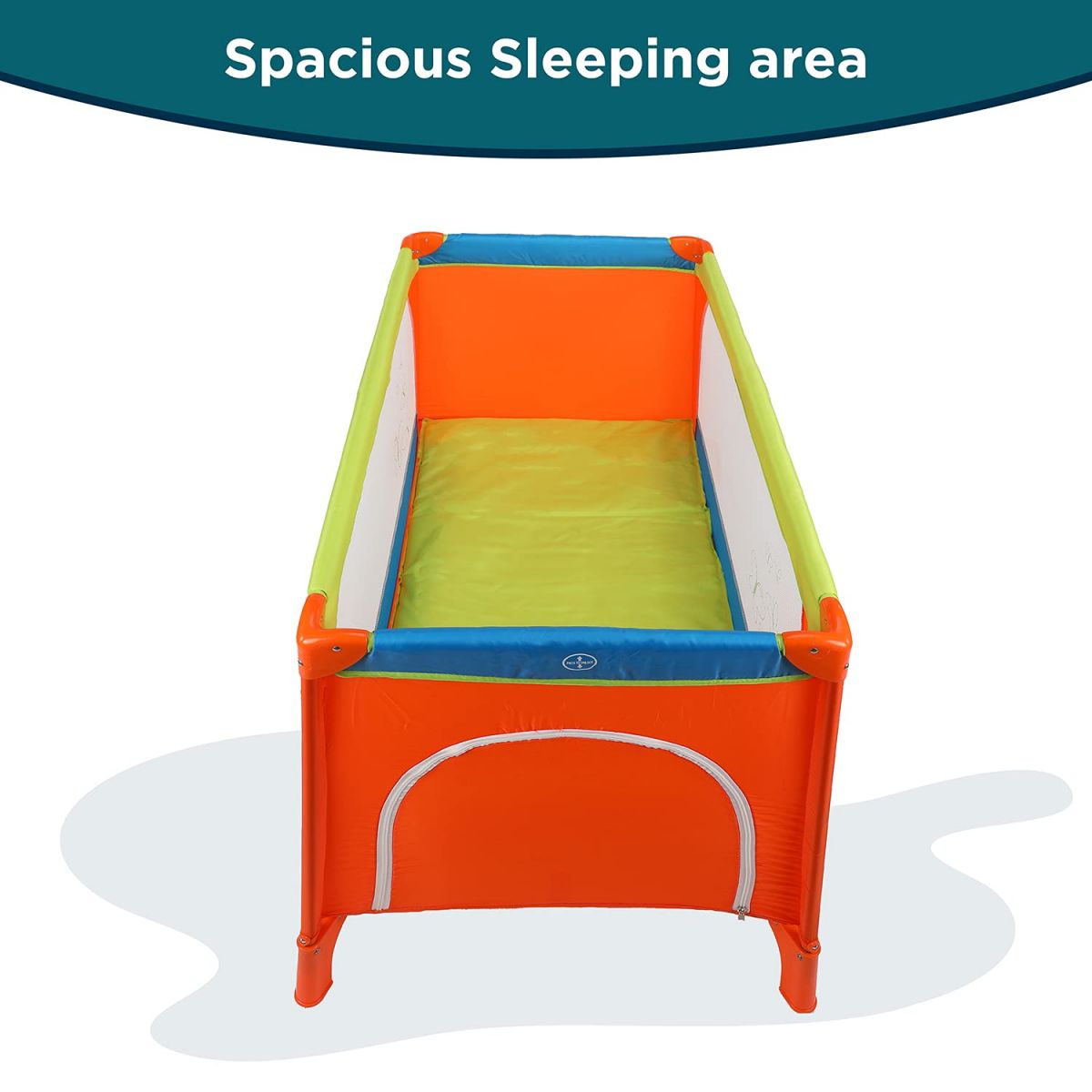 LuvLap Sunshine Playpen is certified as per EN Standards. It has a durable frame and easy-folding system, making it ideal for travel. It has an airy mesh on 2 sides for ventilation and visibility. It is compact, easy to fold and carry, and has 2 handy wheels. It has a convenient zipper door for baby and a 2 cm comfortable mattress. It comes with a Mosquito Net and a convenient travel carry bag