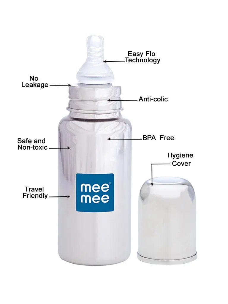 A well-fed baby is a happy baby. Mee Mee Premium Steel Feeding Bottle gives your baby the most comfortable feeding experience with the right intake of feed and reduced air intake through its specially designed anti-colic nipple.