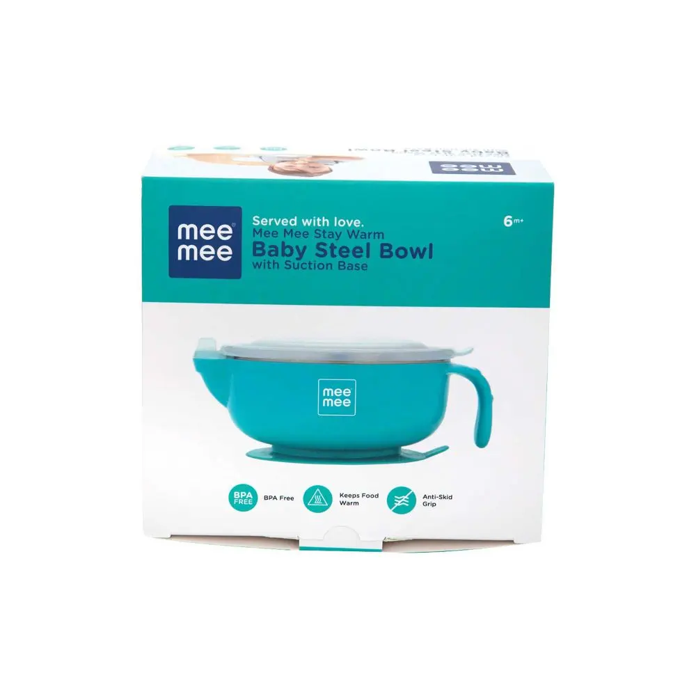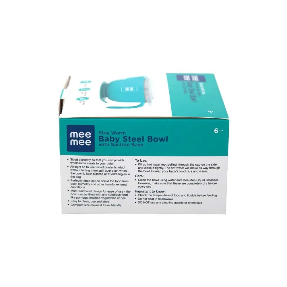 A toddler’s meal time is the most important aspect for his overall growth. Mee Mee Stay Warm Baby Steel Bowl makes it easy for you to feed WARM FOOD to your baby EVERY TIME. It features a unique water chamber that keeps food warm or hot (depending on the temperature of the water). The warm plate is designed with a non-flip and non-slip base, keeping the plate stable and preventing spills and waste <b>Key Features</b><ul> <li>Made of non-toxic, BPA free, food grade stainless steel and polypropylene plastic</li> <li>Complies with International standards of Safety & Hygiene</li> <li>Stainless steel bowl helps to lock in the nutrition so that you serve the best to your baby</li> <li>Silicone suction base holds the bowl in place, reducing spills and accidents during feeding time</li> <li>Equipped with a handle for good grip and control</li> <li>Sized perfectly so that you can provide wholesome meals to your baby </li> <li>Air-tight lid to keep food contents intact without letting them spill over even when the bowl is kept slanted or at odd angles in the bag</li> <li>Perfectly fitted cap to shield the food from dust, humidity and other harmful external conditions</li> <li>Multi-functional design for ease of use – the bowl can be filled with any nutritious food like porridge, mashed vegetables or rice</li></ul> <b>SPECIFICIATION</b><ul> <li>Brand – Mee Mee</li> <li>Type – Bowl</li> <li> Age – 6 Months</li> </ul>