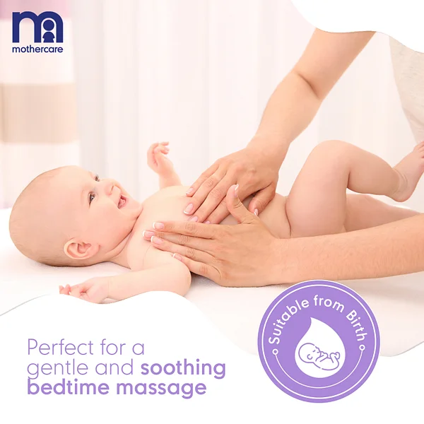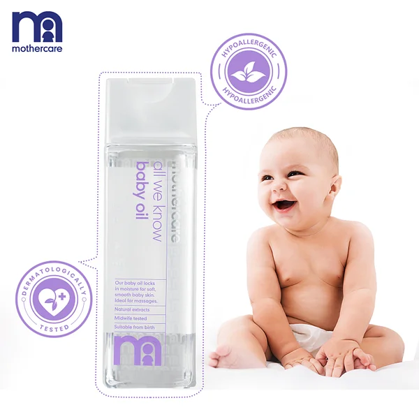 Mothercare All We Know Baby Oil protects your baby’s delicate Skin, keeping it soft and beautiful. Our Baby Oil locks in moisture for soft, smooth baby skin, Ideal for massages. It Contains Olive Oil And Chamomile Extracts , and is perfect for a soothing massage before bedtime or after a bath – good for bonding with your baby.