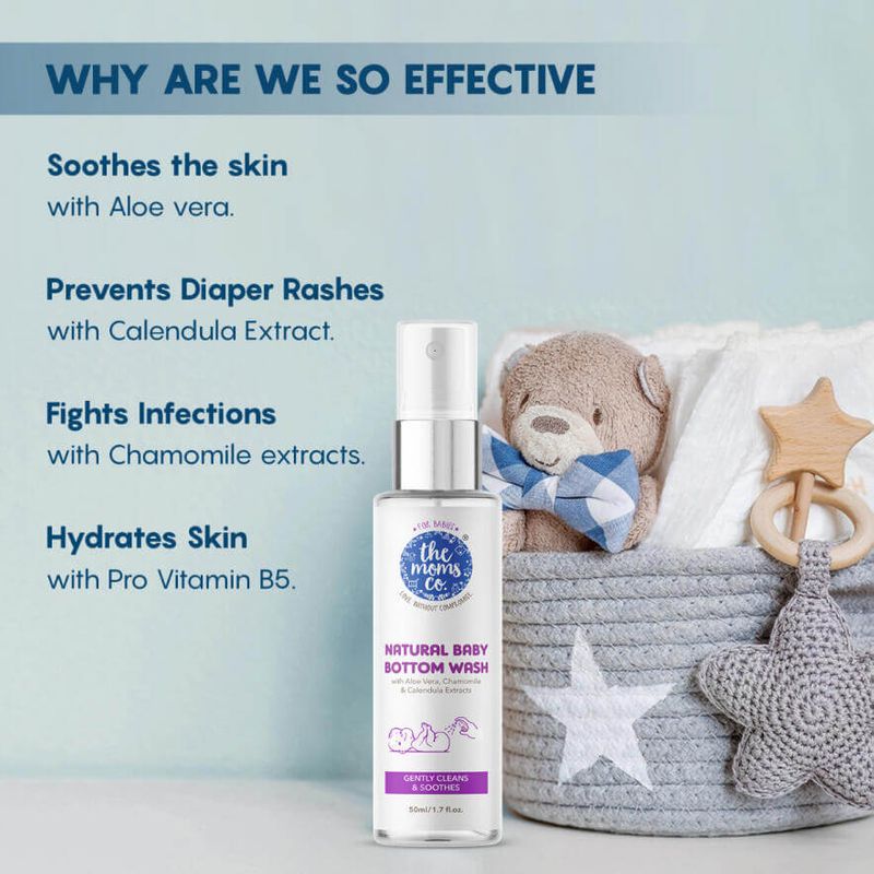 We know that for any mother, her little ones’ hygiene and comfort is of utmost importance. The Moms Co. Natural Baby Bottom Wash makes for the perfect partner for those messy diaper duties. Made with gentle, plant-based cleansers, our Natural Baby Bottom Wash keeps diaper area clean, and ingredients like Aloe Vera, Chamomile, Calendula Extract & Panthenol, soothe & refresh the baby’s sensitive skin.