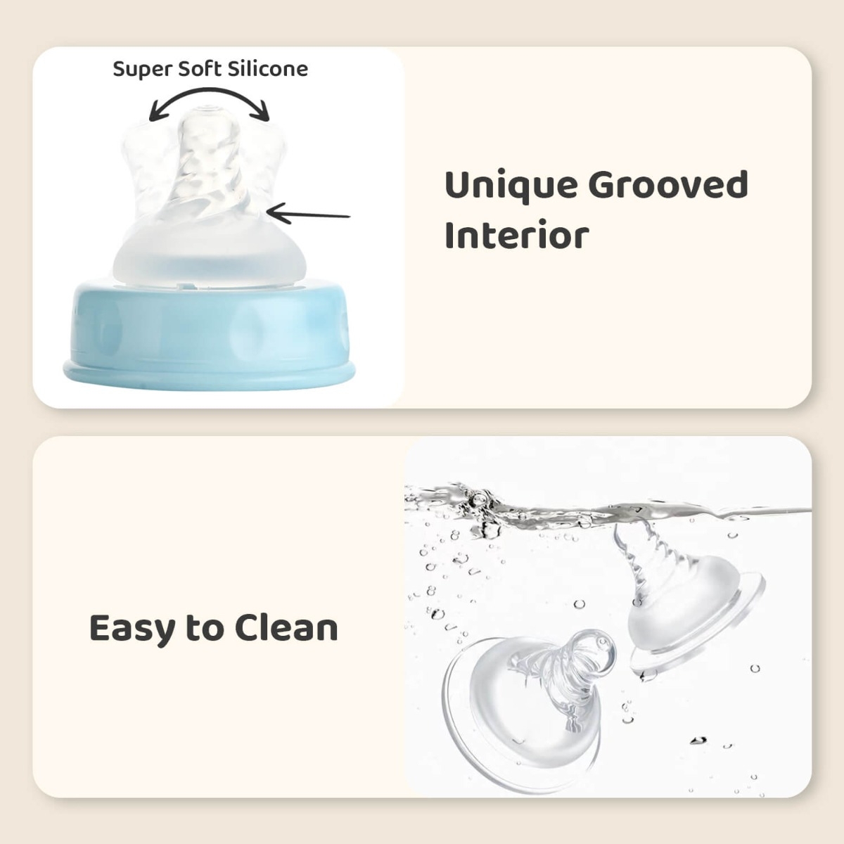 Super Soft Silicone Nipple: Made with soft silicon, the nipple mimics the look and feel of the breast and is best for the gums of babies