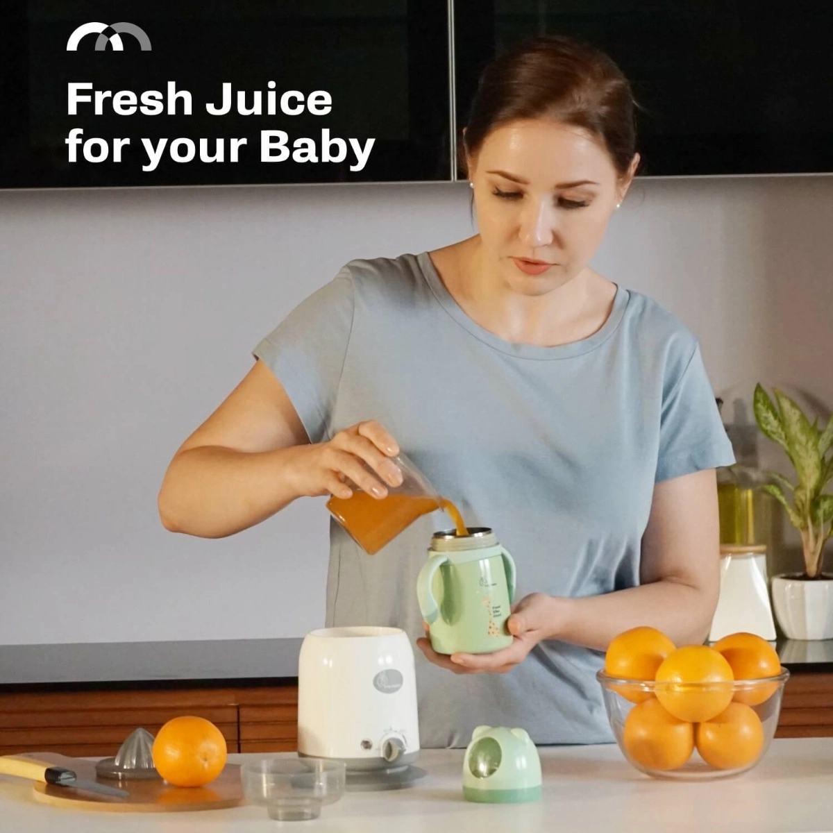 Juice maker: Easily switch it from a food warmer to a juicer by putting the juicer attachment on top of the food cup. Put cut fruits into the juicer and give your baby fresh juice when required.
