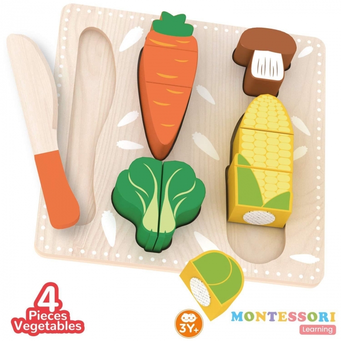 - Cute Vegetables: Cute colourful Vegetables with no sharp edges can be divided into pieces with the help of a wooden knife