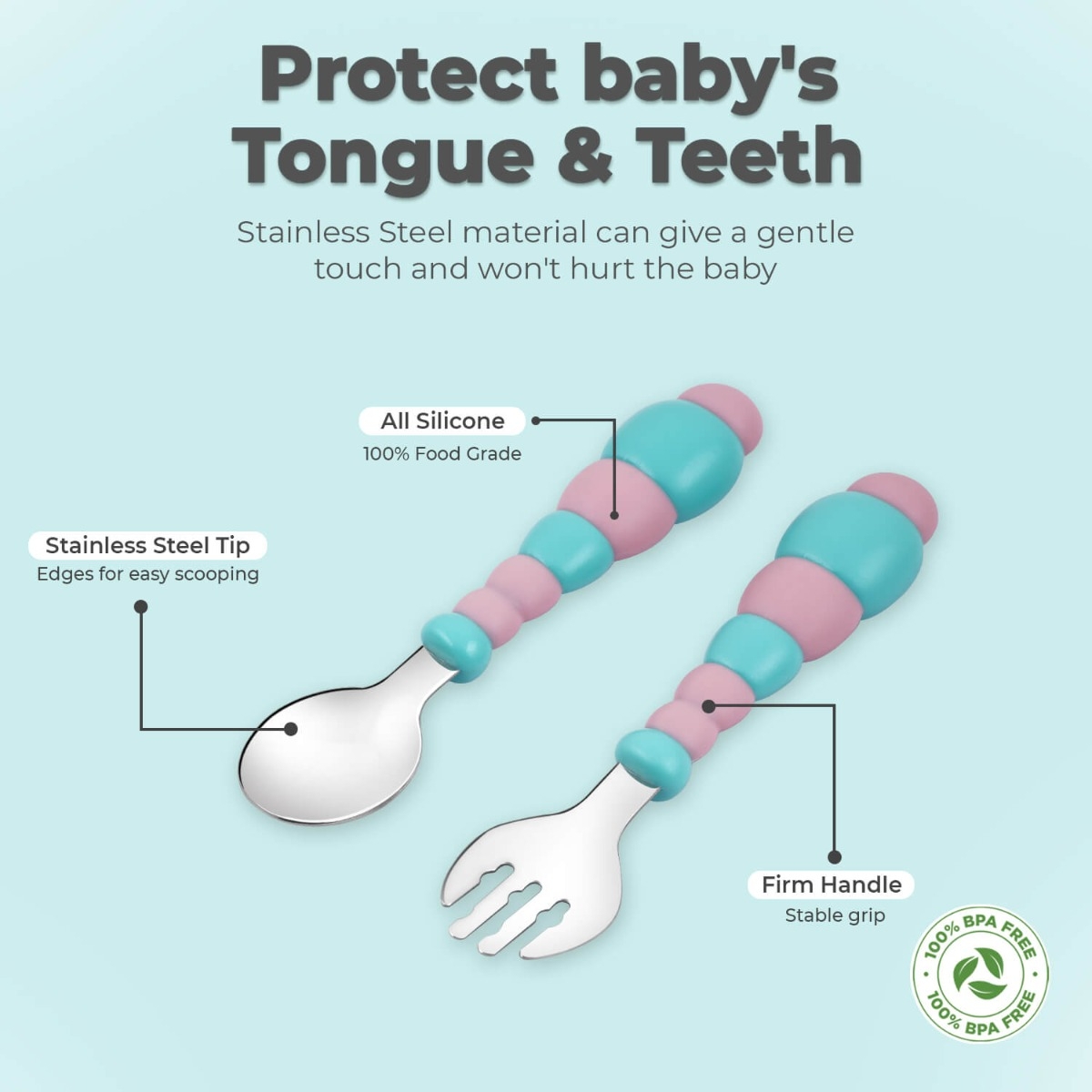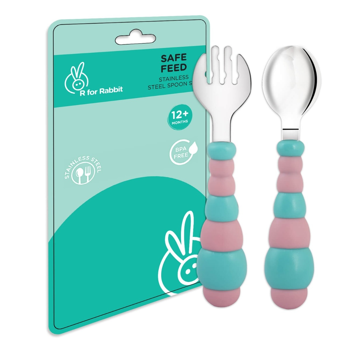 R FOR RABBIT PREMIUM SAFE FEED STAINLESS STEEL BABY SPOON SET FOR BABY FEEDING, STAINLESS STEEL SPOON AND FORK SET, FOR KIDS 12+ MONTHS