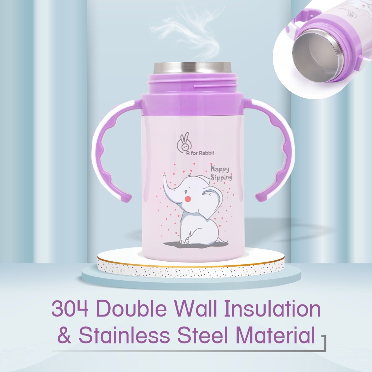 Looking for a safe, comfortable and fun way to teach your kids how to sip independently? Bringing you Steebo Elephant Stainless Steel Sipper Bottles by R for Rabbit. These sipper bottles are made with stainless steel, pp and food grade silicone to ensure complete safety and hygiene for your baby. Its cap assures protection and its leak free design helps you to have hassle-free sipping time. You can also maintain the temperature of liquids inside this bottle for a longer duration due to its double-wall insulation. Have a happy sipping experience with R for Rabbit Steebo Elephant stainless steel sipper bottle.
