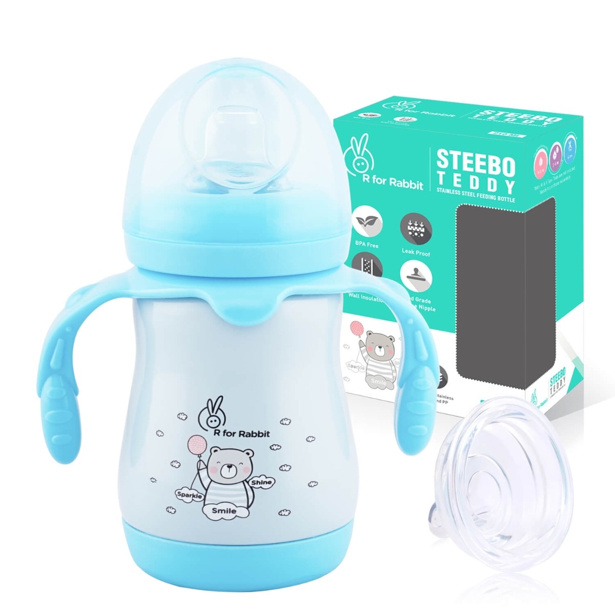 Make your child enjoy the liquids on their own in the best possible way, how? R For Rabbit brings to you the Steebo Teddy stainless steel spout sipper for kids. Steebo Teddy stainless steel spout sipper is an elegant looking & adorable baby spout sipper with smooth handles to hold the bottle on its own and enjoy being independent. This spout sipper is made with stainless steel & food-grade silicone material for total safety. Double-wall insulation helps in maintaining the liquid temperature and protects the little hands from getting burnt. So start the journey of liquids for your little one with the Steebo Teddy Stainless Steel spout sipper.
